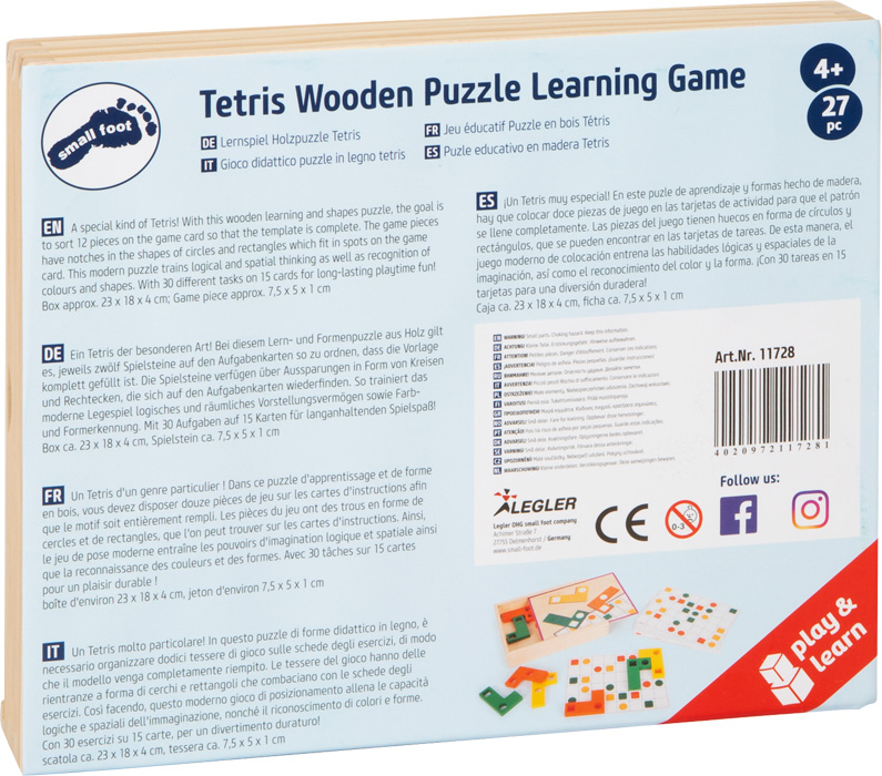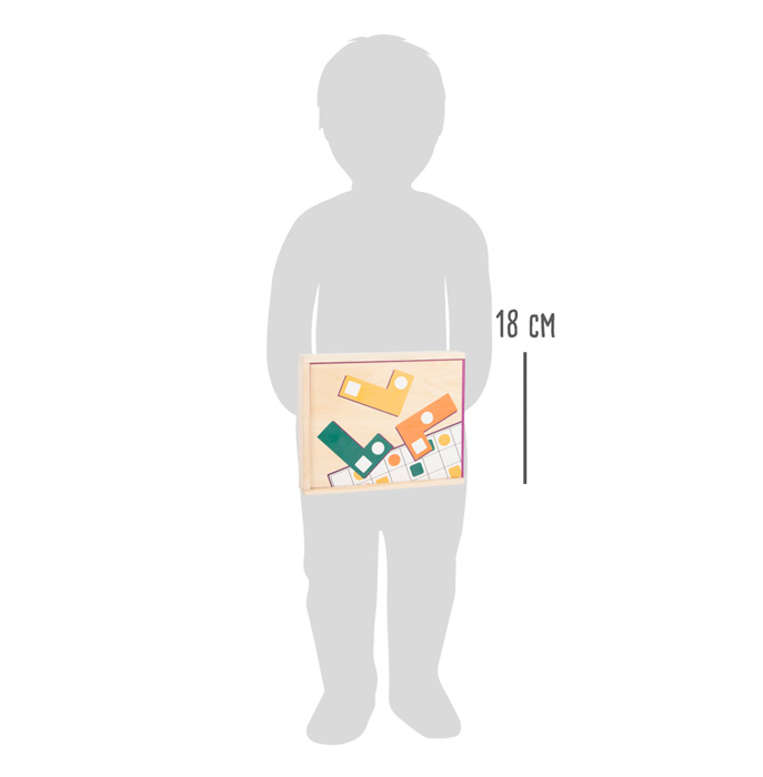Este jogo moderno treina a imaginação lógica e espacial, bem como o reconhecimento de cores e formas. Todas as peças do jogo e cartões de tarefas são armazenados com segurança na caixa de madeira com tampa deslizante, para que possam ser transportados convenientemente.