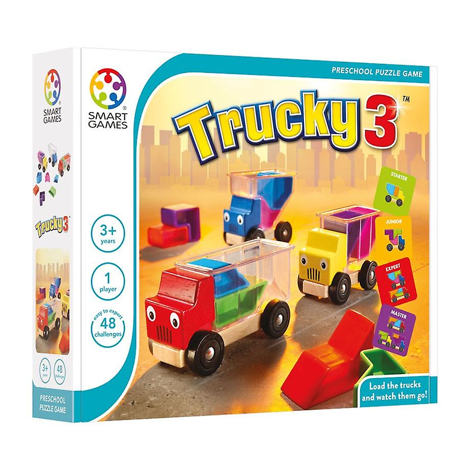SmartGames Trucky 3 é um jogo de quebra-cabeça de um jogador que possui 3 camiões de madeira móveis com recipientes transparentes e 10 blocos plásticos coloridos.
