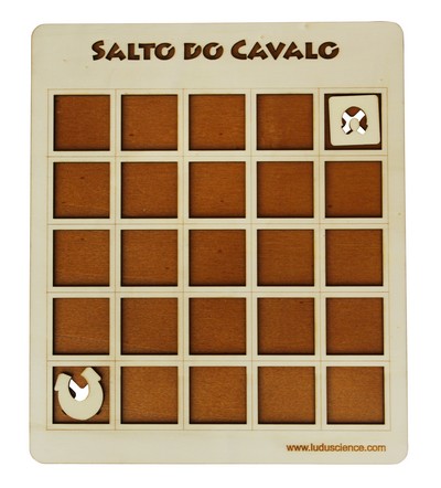 Autor: Domingos Taipa (2011). Jogo: O Salto do Cavalo nasceu de um desafio lançado aos alunos da disciplina Desafios da Universidade Sénior de Penafiel em 2010/2011. O seu autor, Domingos Taipa, aluno da Universidade Sénior de Penafiel, em colaboração com a LuduScience desenvolveu um jogo matemático baseado no movimento da peça do cavalo do jogo do Xadrez. Este projeto é mais uma criação LuduScience que contou com a colaboração da Associação dos Cegos e Amblíopes de Portugal (ACAPO), Associação para o Desenvolvimento Sócio-Cultural, Recreativo e Económico de Penafiel (ADISCREP) e com o Museu Municipal de Penafiel. É de realçar que o jogo "Salto do Cavalo" está acreditado pela ACAPO podendo portanto ser jogado por qualquer pessoa cega ou de baixa visão. Objetivo: Ser o último a realizar uma jogada, isto é, deixar o adversário sem possibilidade de jogar. Classificação: Jogo matemático. Material: Tabuleiro de 25 casas (5 por 5), 2 peças ferradura e 23 peças circulares.