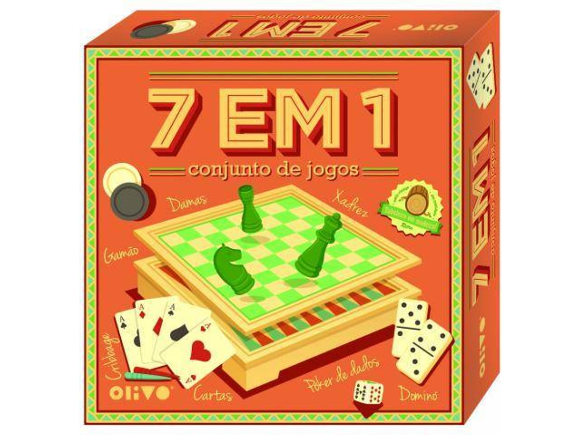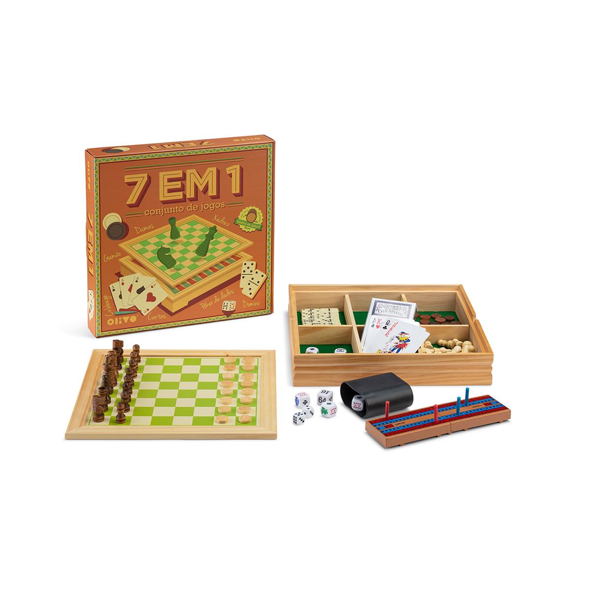 Conjunto de Jogos 7 em 1, um set de jogos de tabuleiro clássicos com peças em madeira.