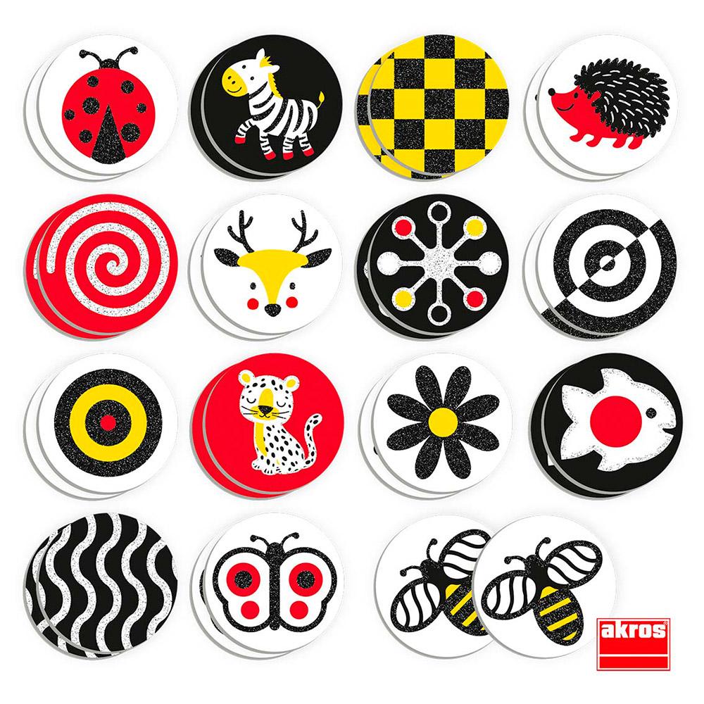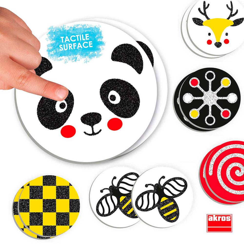 As características dos seus cartões fazem dele um recurso divertido para desenvolver a discriminação visual e a discriminação tátil. O formato de seus cartões com texturas ásperas e ilustrações contrastantes em cores primárias (branco, amarelo, vermelho e preto) permite diferenciá-los entre si.