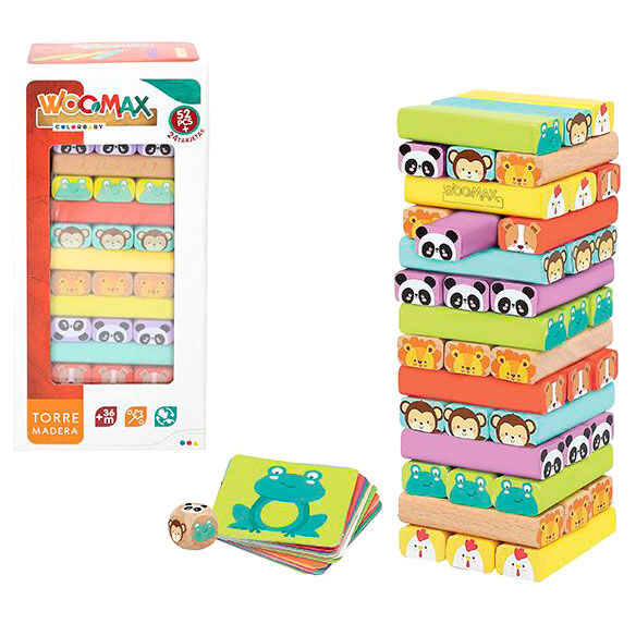 Conjunto de blocos em madeira natural Woomax, inclui 52 peças + 24 cartas, medidas da torre construída 11,5x8x24,5 cm 4 possibilidades de jogo: jogo de equilíbrio, jogo de cartas, jogo de construção criativa e corrente de dominó Todas as peças são em madeira natural pintadas com tinta não tóxica de base aquosa e com cantos arredondados para a segurança das crianças. Este brinquedo estimula os sentidos, desenvolve a imaginação, habilidades motoras finas, coordenação olho-mão e socialização Seu uso é recomendado para meninos e meninas a partir dos 3 anos