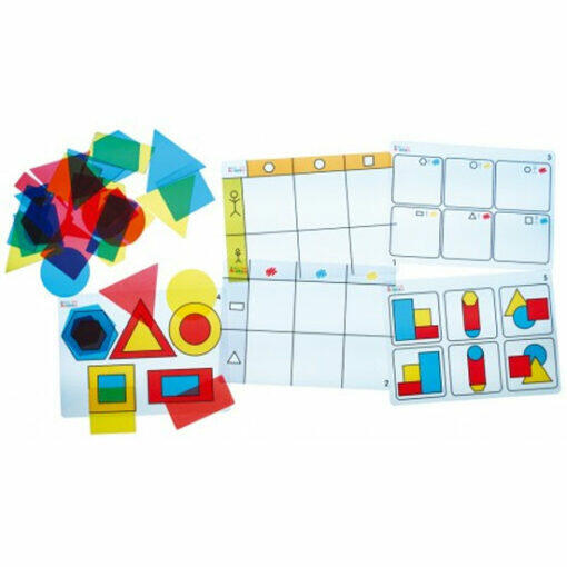 Inclui 5 cartões transparentes com atividades que 5 crianças podem fazer ao mesmo tempo com as 60 formas (5 formas, 3 cores e 2 tamanhos) e dois cordões para realizar mais atividades.