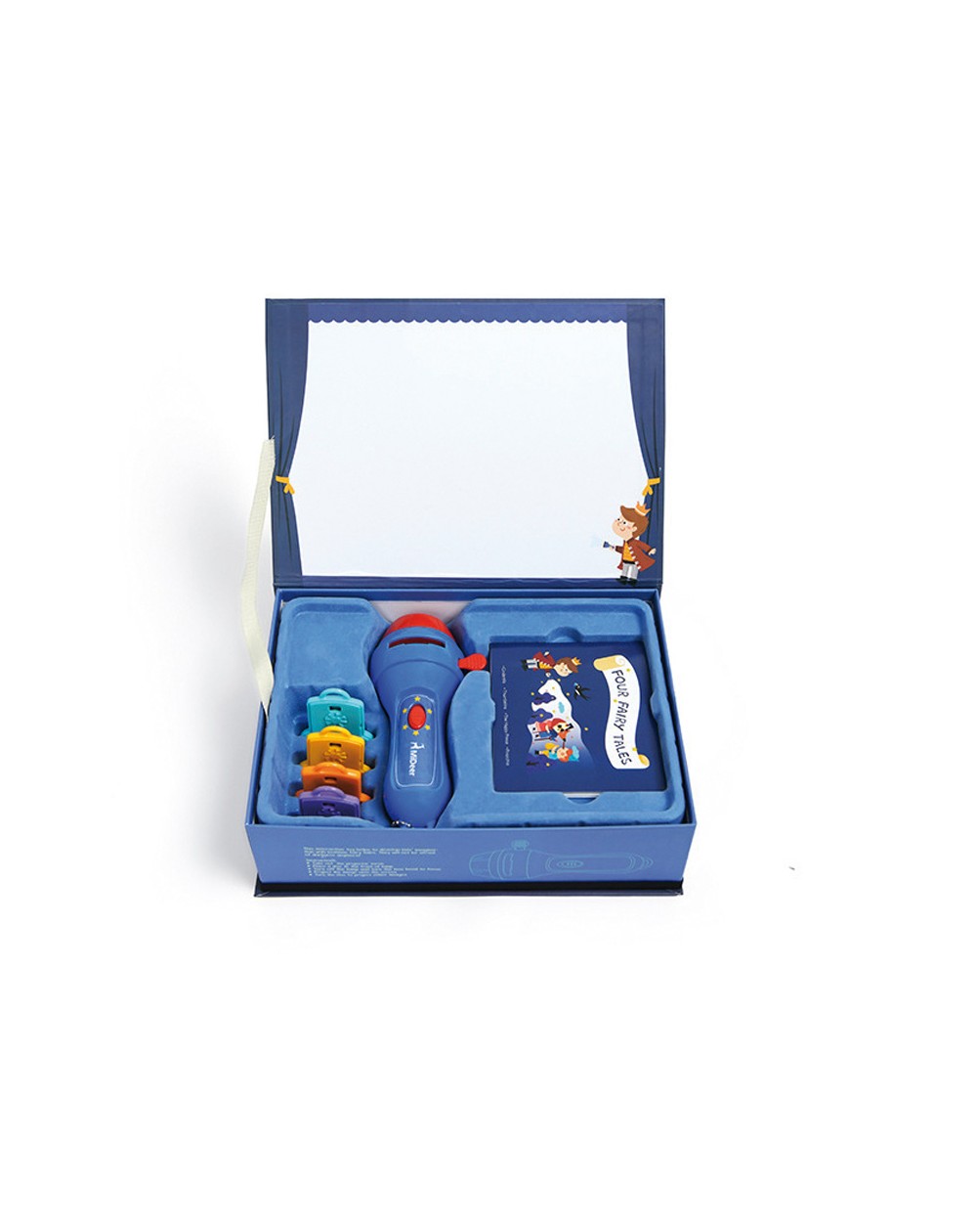 Caixa com lanterna projetada e quatro histórias populares para crianças.