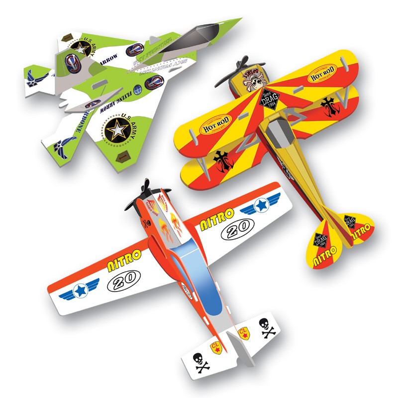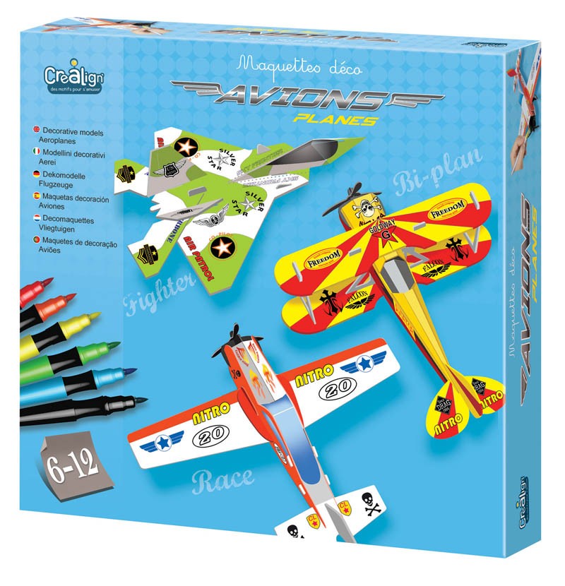 Graças a esta caixa, as crianças podem montar e personalizar seus modelos de aviões de papelão pré-cortado.