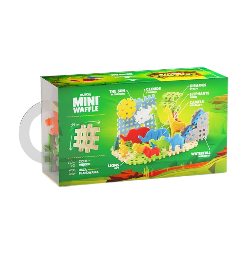Incentiva a criatividade e a imaginação das crianças com brincadeiras interativas Feito de materiais 100% certificados e seguros para crianças Horas de diversão — não só para crianças! Cria formas em 2D e 3D 50 peças coloridas! Formas de blocos inovadoras Feito na Polónia Blocos e embalagens produzidos a partir de materiais renováveis e reciclados Adequado para crianças a partir de 3 anos Brincar com blocos MINI WAFLE é uma maneira fantástica de desenvolver habilidades motoras, aprender o pensamento lógico e estimular a criatividade desde cedo.