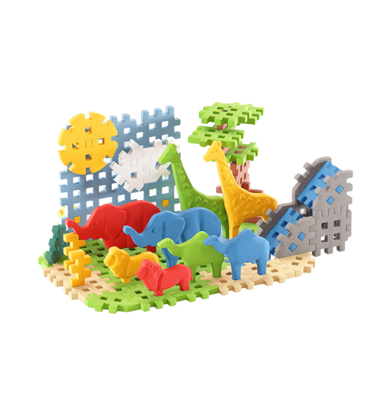 Graças ao seu design exclusivo, os blocos encaixam-se facilmente, permitindo que as crianças construam estruturas 3D, enquanto as figuras planas de animais se tornam moradores perfeitos do mundo criado na savana.