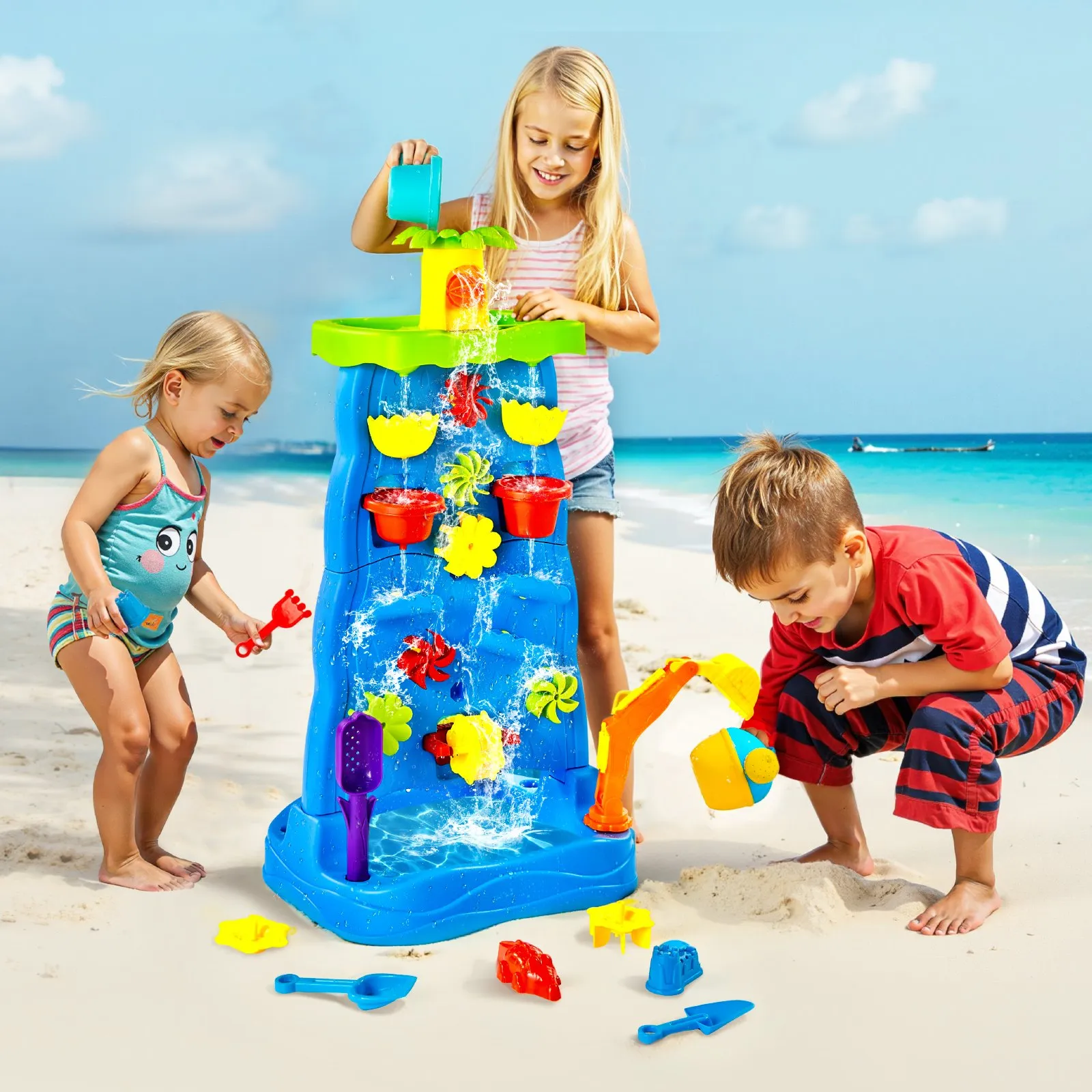 Diversão Versátil 2 em 1: A mesa de água e areia VEVOR vem com 37 acessórios, incluindo moinhos de vento de água, coqueiros, ferramentas de praia, rodas d'água, uma escavadeira, um barco e muito mais. Com esses acessórios, as crianças podem se envolver em atividades emocionantes, como criar uma cachoeira de coco, formar uma equipe de engenharia de areia e experimentar a emoção de flutuar na água.