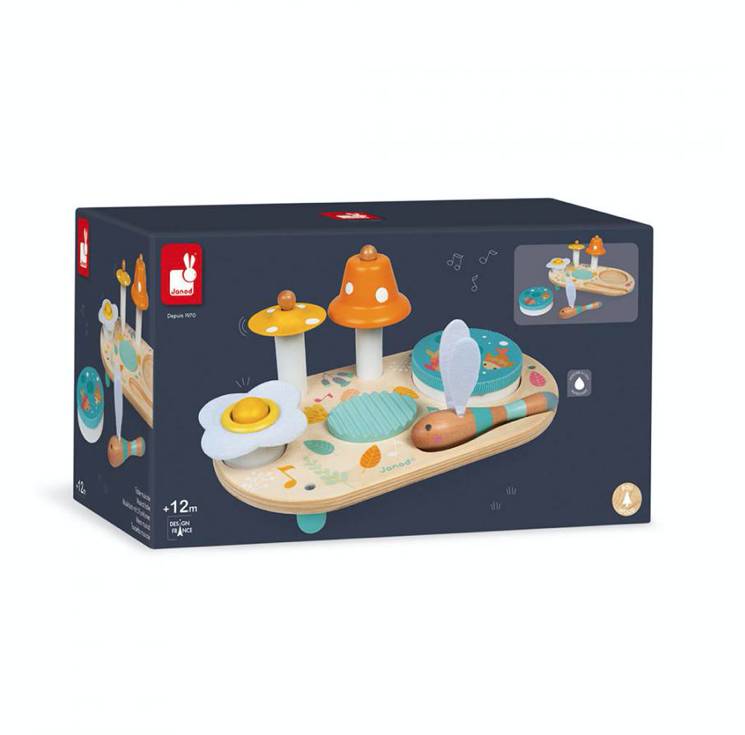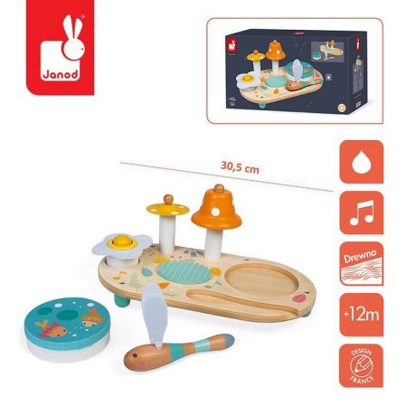 Mesa musical composta por um prato, um sino, um raspador, um poët-pouët e um pandeiro removível.