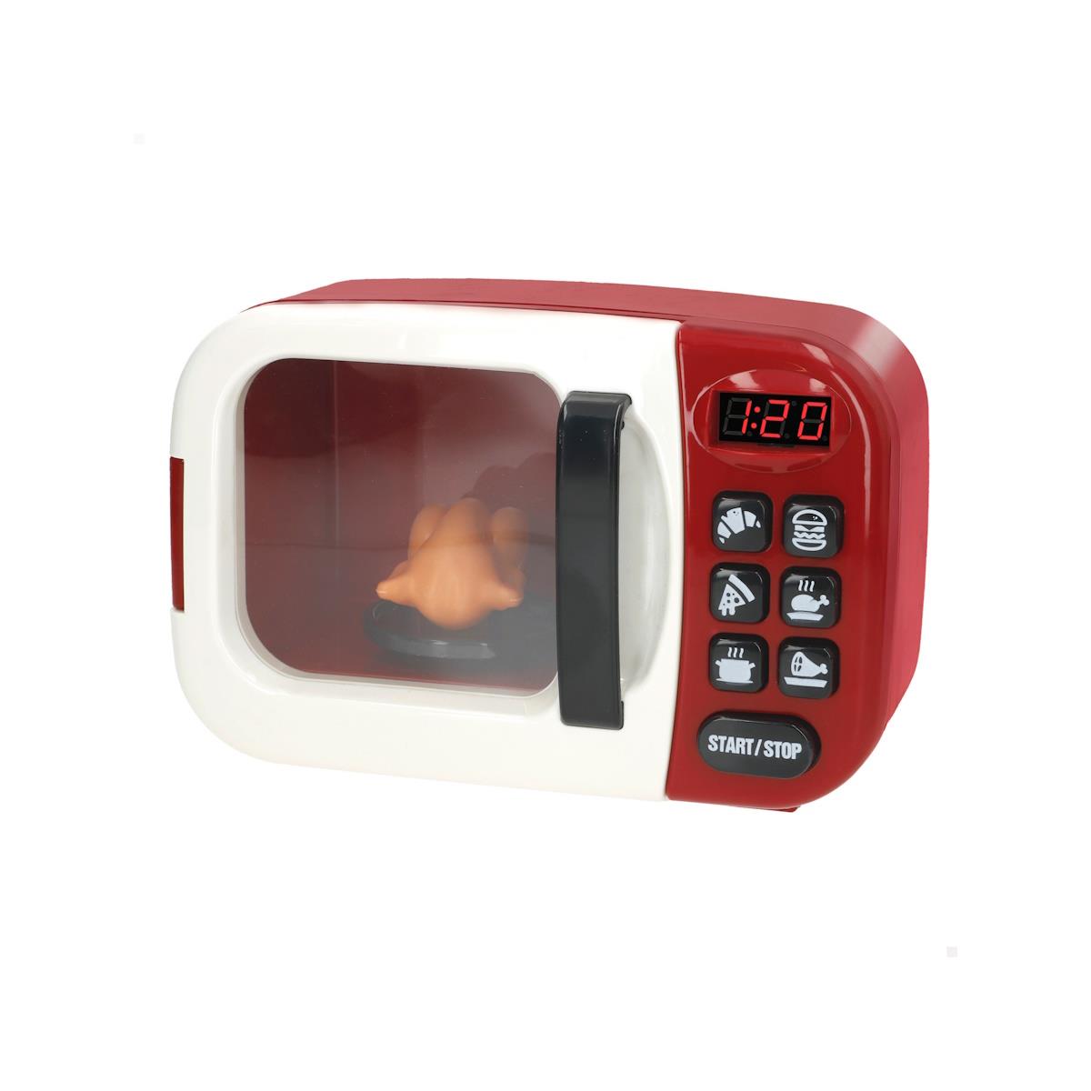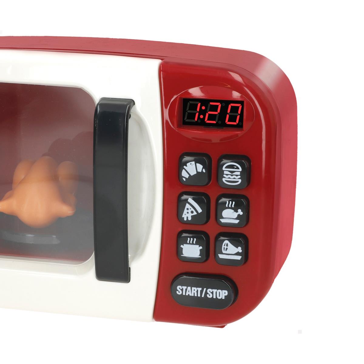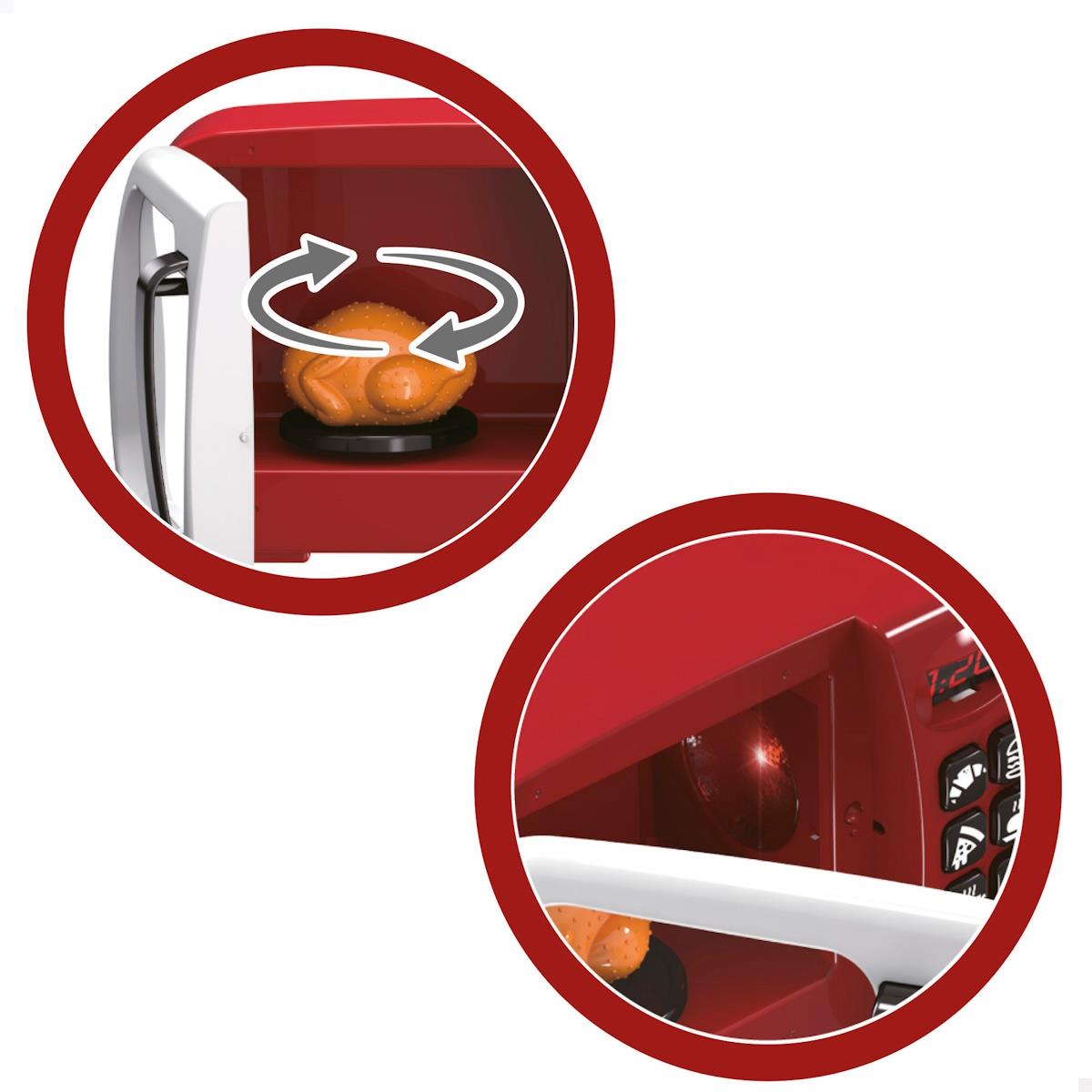 Inclui: 1 micro-ondas com temporizador com ecrã digital, bandeja rotativa, luz e som e uma pequena pizza de brincar