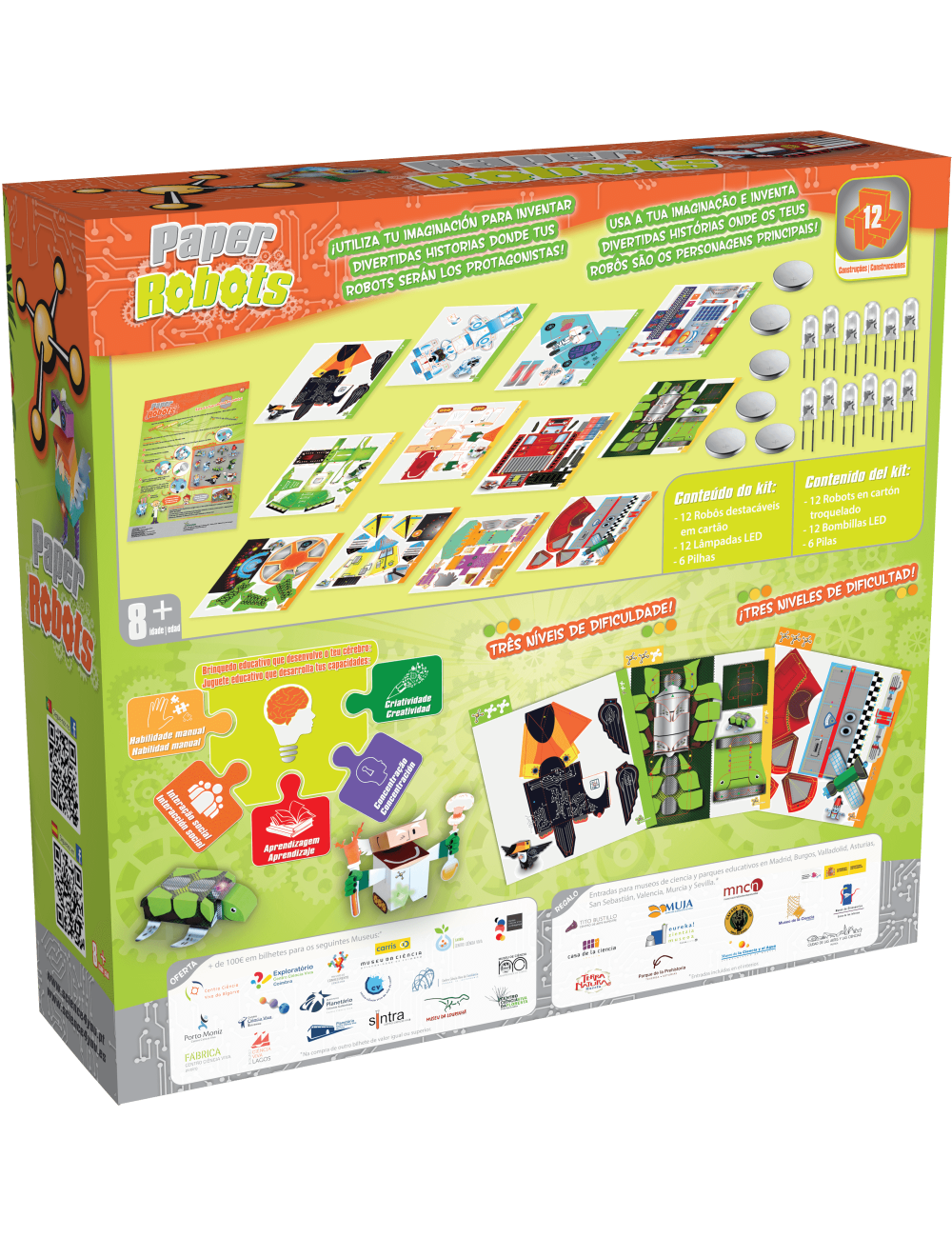 Contrói estes 12 robots de cartão, dá-lhes vida com as luzes LED e usa a tua imaginação para brincares e criares histórias super divertidas.