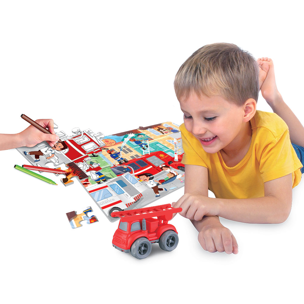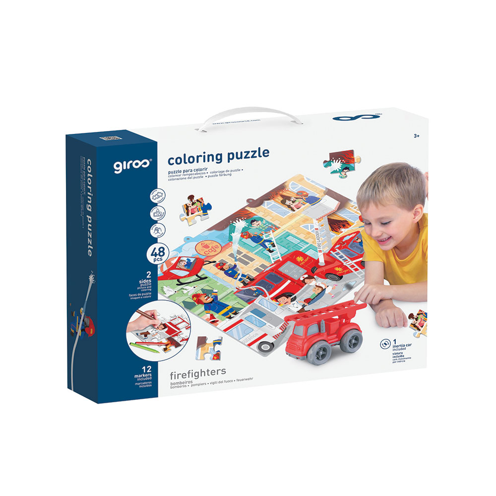 Puzzle infantil super divertido com 2 faces. Um dos lados vem com excelente acabamento mate com 48 peças grandes. O outro lado vem com desenho divertido para colorir e pintar depois de montado o puzzle por colorir. Este puzzle duplo permite à criança montar um puzzle normal de 48 peças e verificar que no verso existe um puzzle para colorir. Inclui 12 marcadores para colorir. Inclui ainda um veículo temático que permite à criança brincar no circuito definido pelo próprio puzzle. Tema: Os Bombeiros