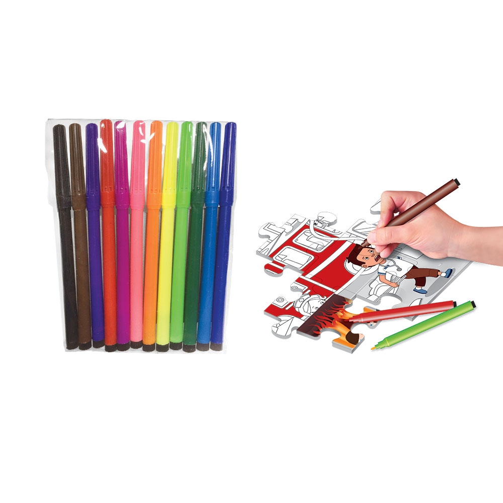 Inclui puzzle dupla face com 48 peças, 12 marcadores para colorir e veículo temático.