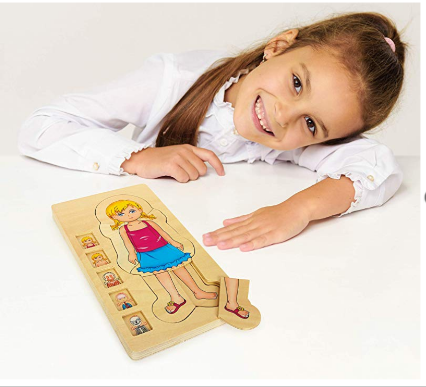 Aqui as crianças aprendem mais do que destreza e reconhecimento de formas e cores - porque o corpo é mostrado em quatro camadas desde o esqueleto até a criança vestida! Cinco pequenas janelas ajudam no quebra-cabeça das quatro camadas com sete peças cada. Divertido quebra-cabeça educacional feito de madeira compensada de alta qualidade com detalhes finos em impressão colorida!