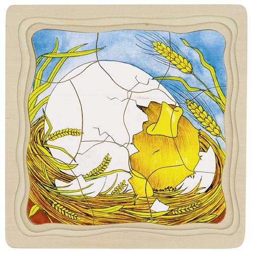 Aprenda brincando com a natureza. Olhe para as 4 camadas do puzzle que ensinam a partir de um ovo que a galinha desenvolve.