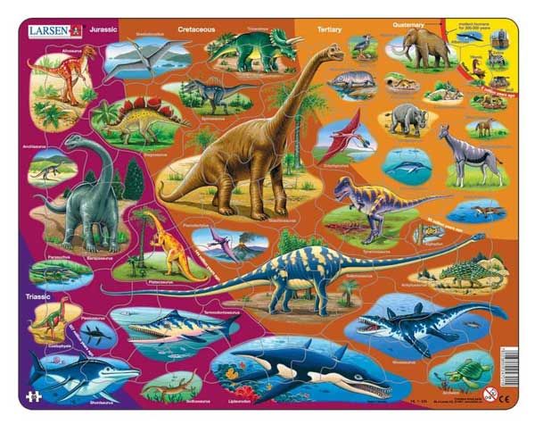 Veja e aprenda com este puzzle histórico e ilustrativo que apresenta a evolução dos dinossauros desde o período Triássico até o período Quaternário. Podes ajudar a explorar como eram os dinossauros há mais de 200 milhões de anos? Uma variedade de dinossauros são apresentados, incluindo o carnívoro Tiranossauro Rex, para o Temnodontossauro nadador. Durante cada período verás a evolução dos dinossauros nadadores que existiam. Estes incluem o Plesiosaurus, Temnodontosaurus, Shonisaurus, Nothosaurus, Lipleuroden e o Mosasaurus. Ao longo do período Jurássico, Cretáceo, Terciário e Quaternário, encontrarás o Archosaurus, Allosaurus, Stegosaurus, Quetzalcoatlus, Triceratops, Spinosaurus, Pterodactyls, Gastormis, Moeritherium, Mammoth, Phenacodus, Uintatherium, Smilodon, Ambulocetus, Criorhynchus, Ankylosaurus, Seismosaurus, Braquiossauro e o Barapassauro. O puzzle possui algumas cores vibrantes, 85 peças menores e é mais adequado para crianças mais velhas