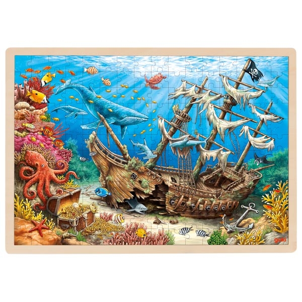 Esse puzzle de madeira mergulha pequenos marinheiros no fascinante mundo de piratas, tesouros escondidos e animados reinos subaquáticos.