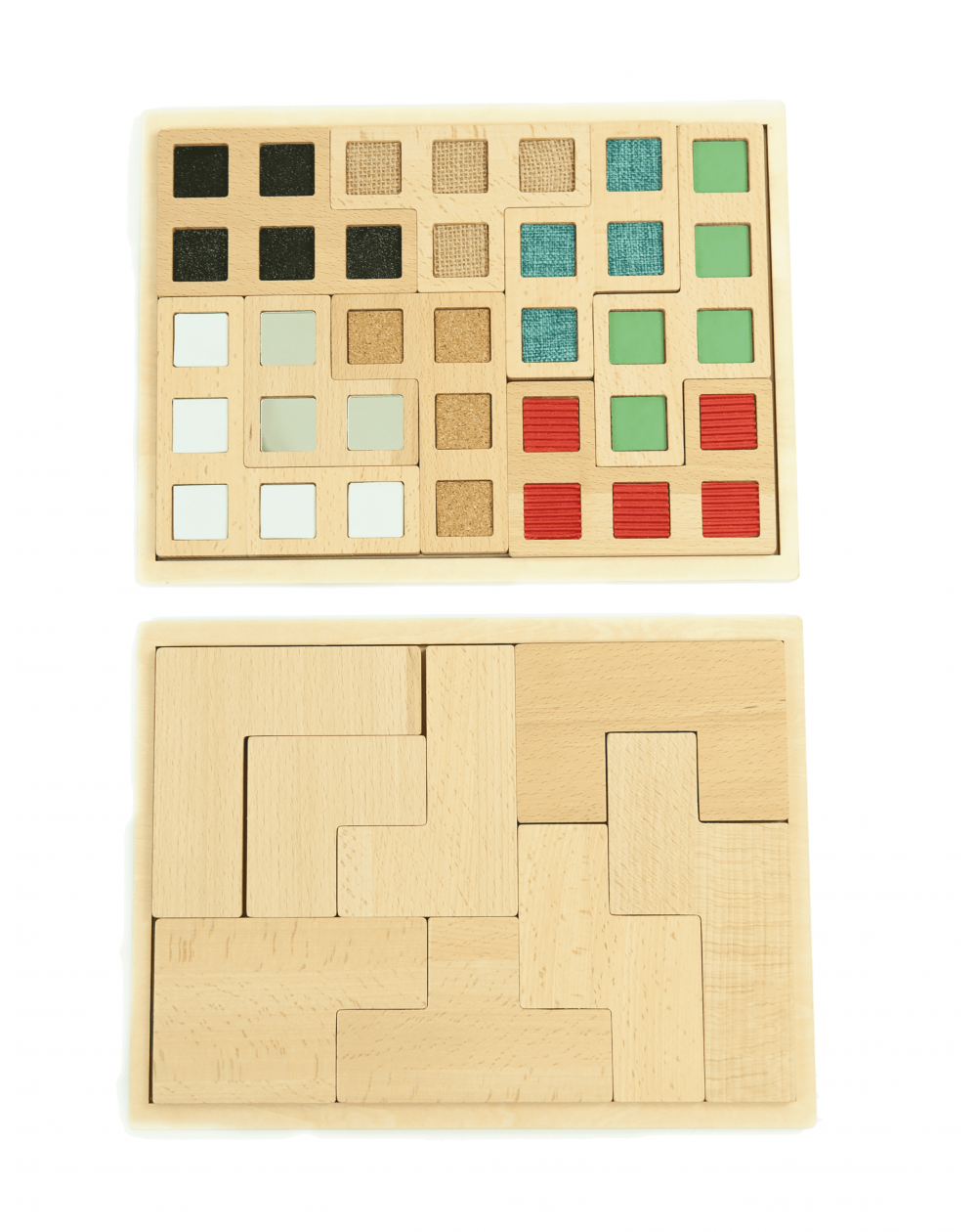 Colocar as peças com as texturas voltadas para cima, em um dos tabuleiros e reproduzir a mesma disposição das peças, no outro tabuleiro, através de estimulação sensorial e sem referência visual.