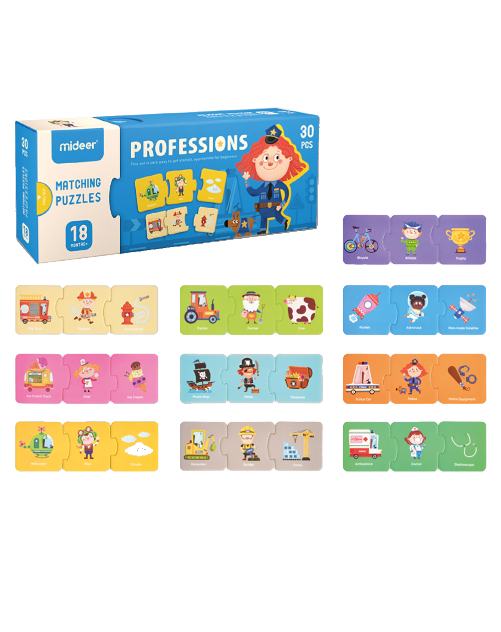 Cada puzzle vem com 3 peças temáticas para as crianças para combinar e aprender sobre como as coisas são acasaladas.