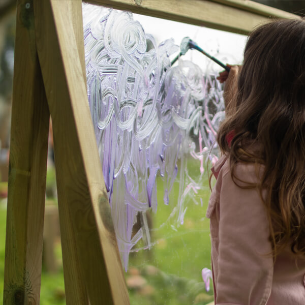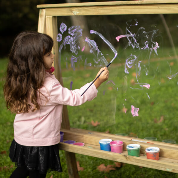 O quadro é uma grande placa de metacrilato onde as crianças podem pintar de ambos os lados. O metacrilato é um plástico reciclável que é muito transparente e fácil de limpar quando se pinta sobre ele. O quadro tem uma base onde se pode deixar marcadores e tintas enquanto as crianças se divertem com ele. Idade: A partir de 3 anos.