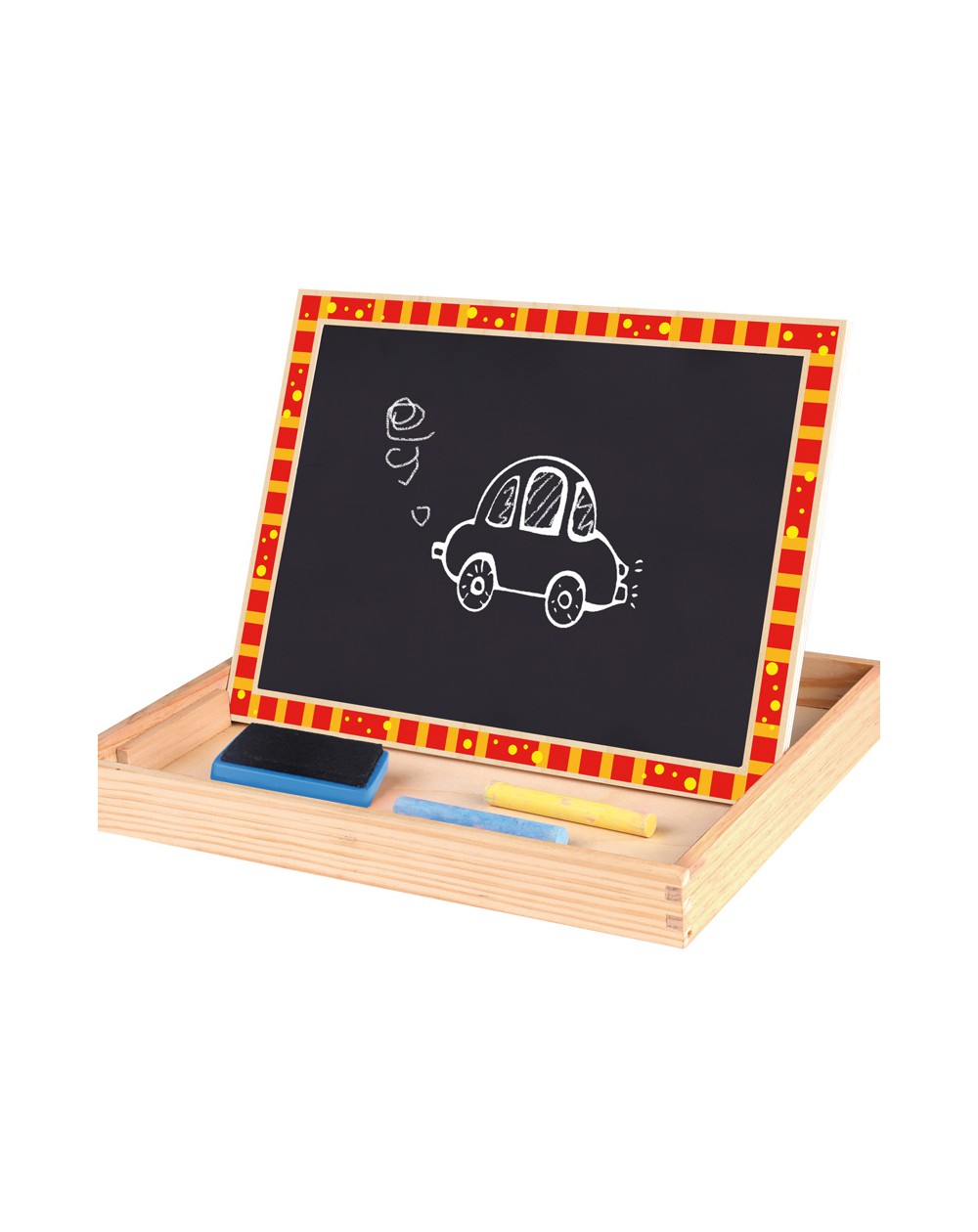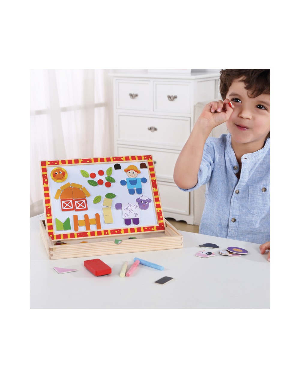 De um lado está um quadro negro e do outro um jogo com formas e peças magnéticas coloridas, com motivos agrícolas (incluídos).