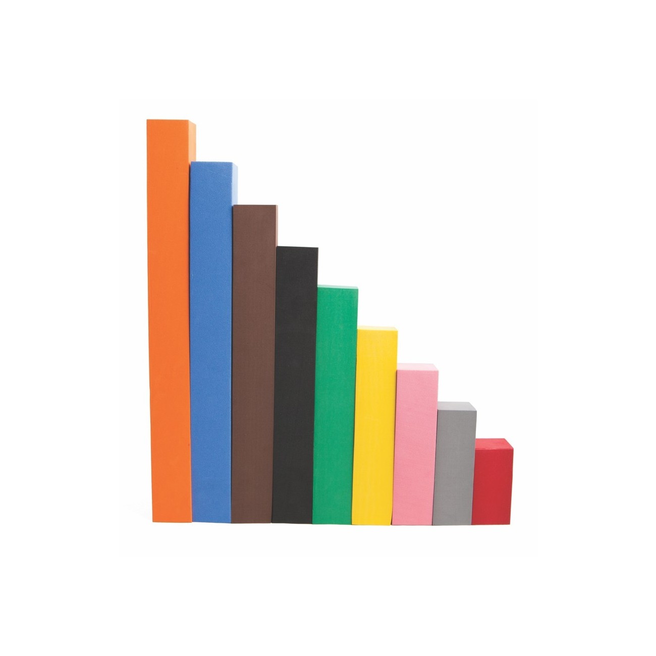 Conjunto composto por: 1 laranja (nº10) 45 cm, 1 azul (nº9) 40,5 cm, 1 castanho (nº8) 36 cm, 1 preto (nº7) 31,5 cm, 1 verde escuro (nº. 6) 27 cm, 2 amarelos (nº 5) 22,5 cm, 2 rosa (nº 4) 18 cm, 3 verdes claros (nº 3) 13,5 cm, 5 vermelhos (nº 2) 9 cm e 12 brancos (não .1) 4,5 cm.