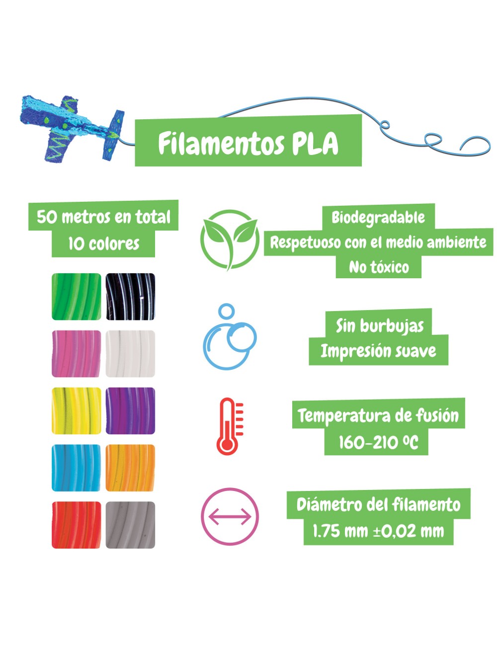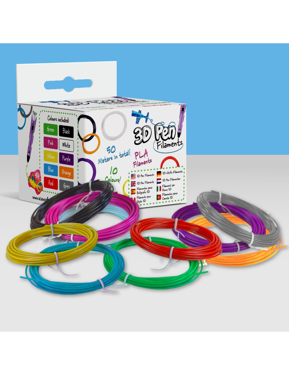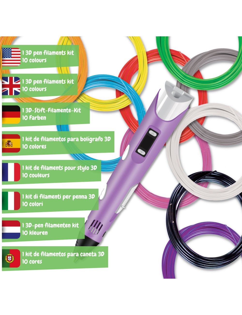 Conjunto de recargas com 10 filamentos coloridos PLA para caneta 3D.