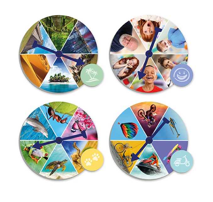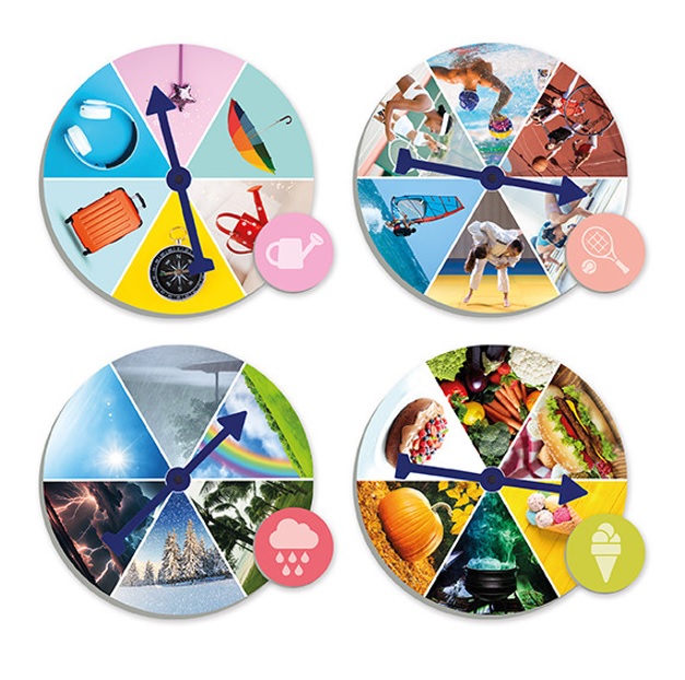 Conteúdo: 8 roletas com imagens reais (11,5 cm), 2 roletas regraváveis ​(11,5 cm), 10 cartões circulares (4,2 cm), 1 cartão para a vez de falar (7 cm) e 1 caneta hidrográfica.