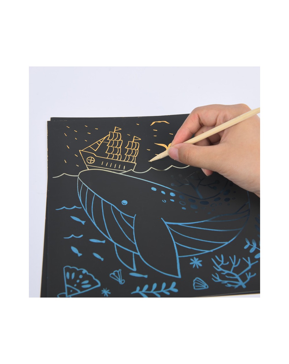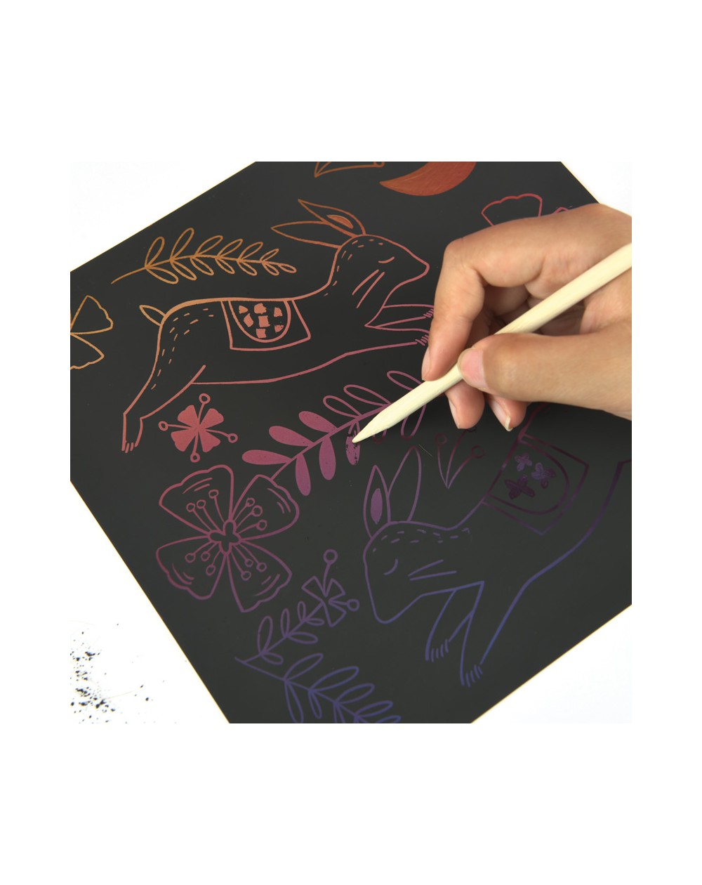 Use a caneta de bambu para arranhar suavemente o papel, o padrão colorido aparecerá na sua frente.