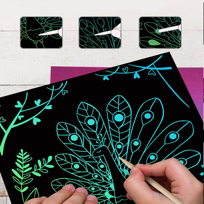 Use a caneta de bambu para arranhar suavemente o papel, o padrão colorido aparecerá na sua frente.