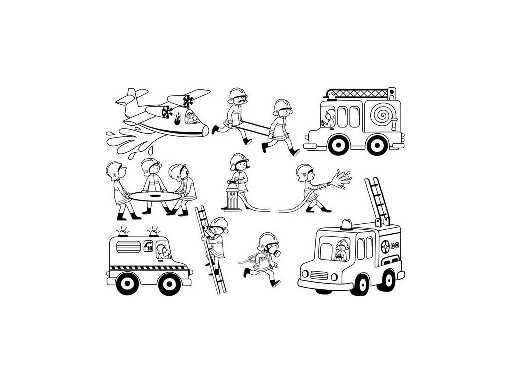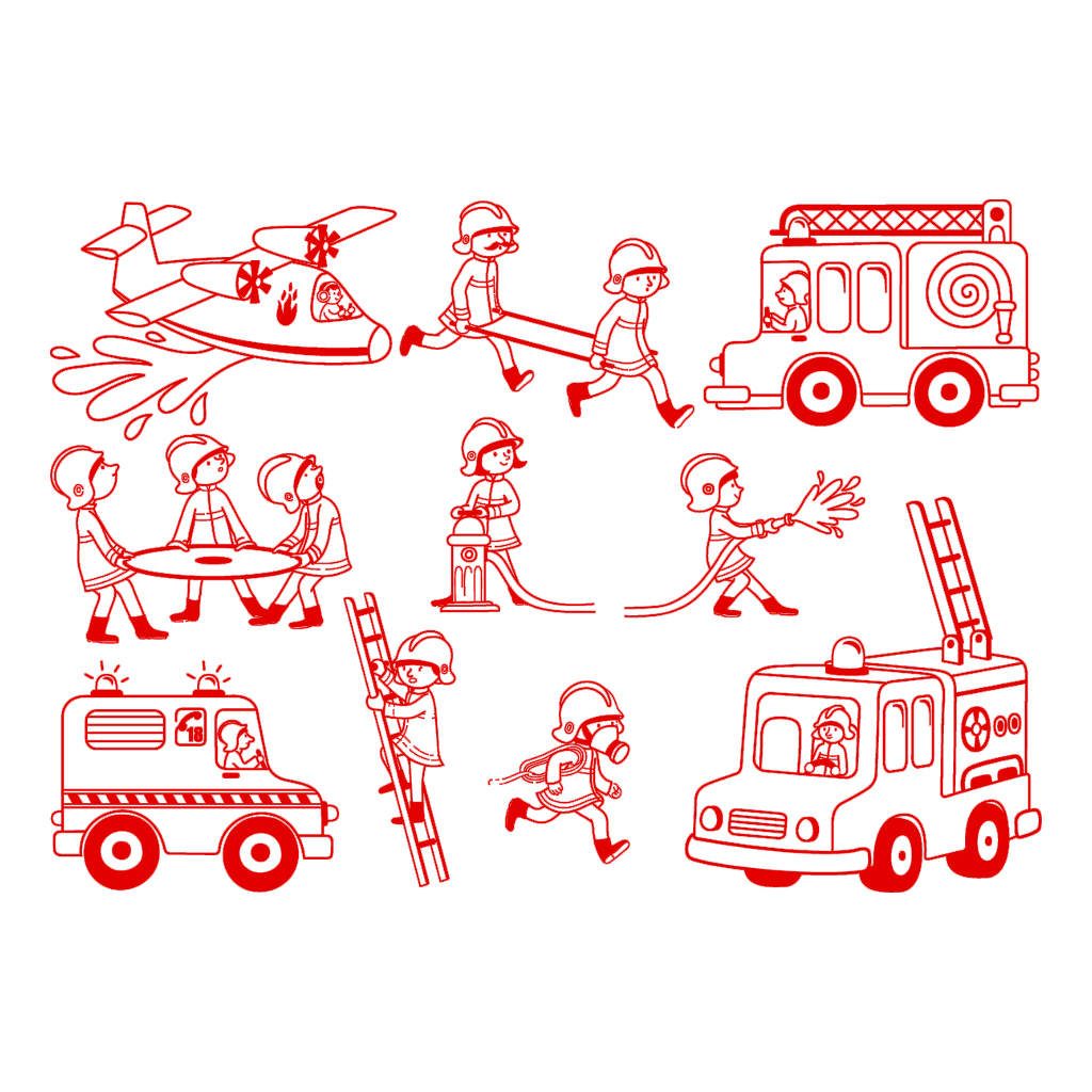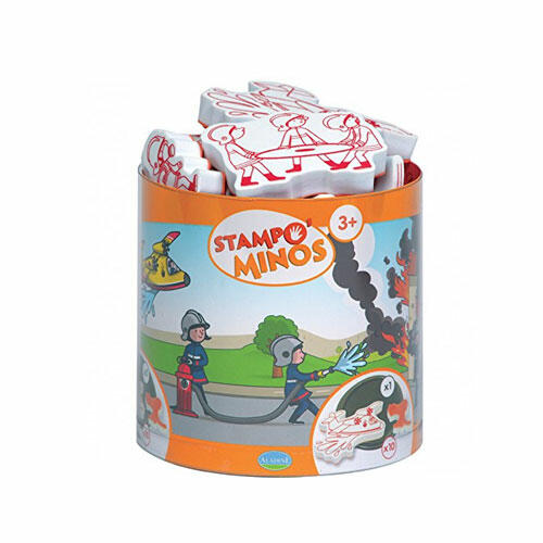 Pote com carimbos variados e tinta preta para carimbo Stampo Minos (adequada para crianças acima de 3 anos). Os desenhos incluem temas de bombeiros e situações do dia a dia.