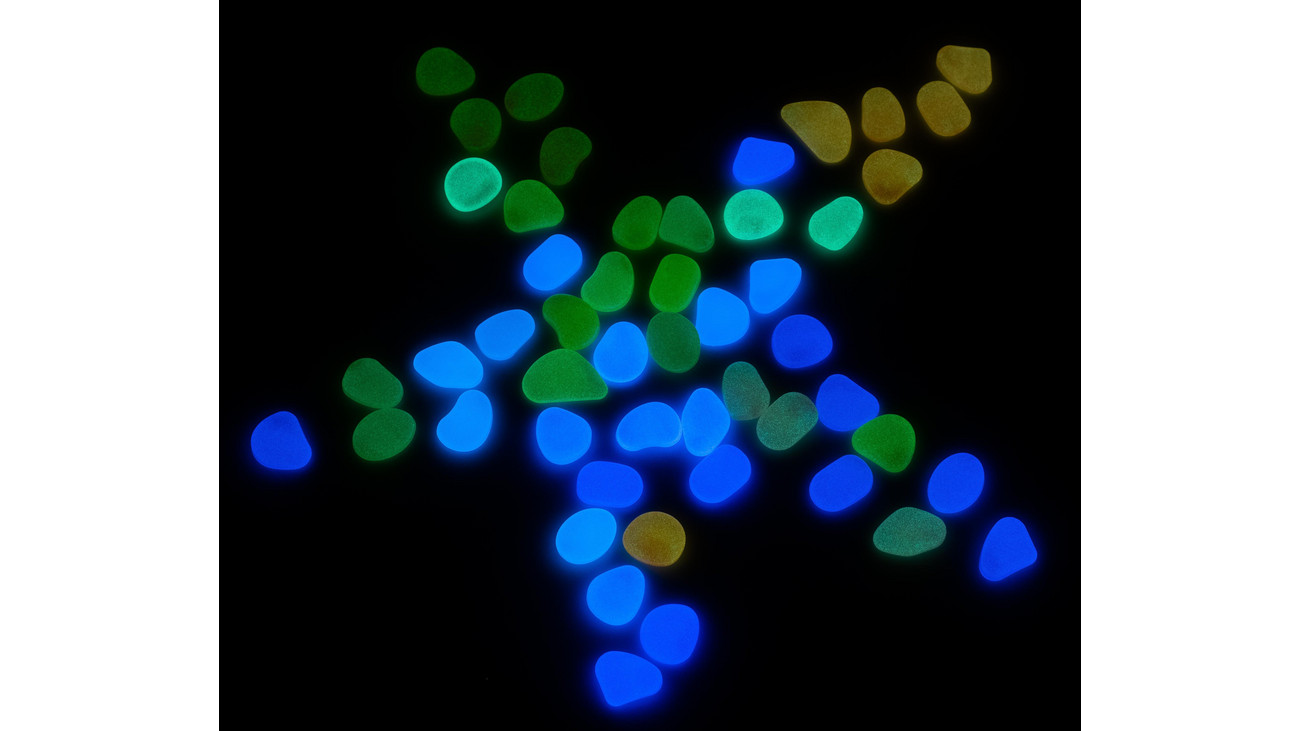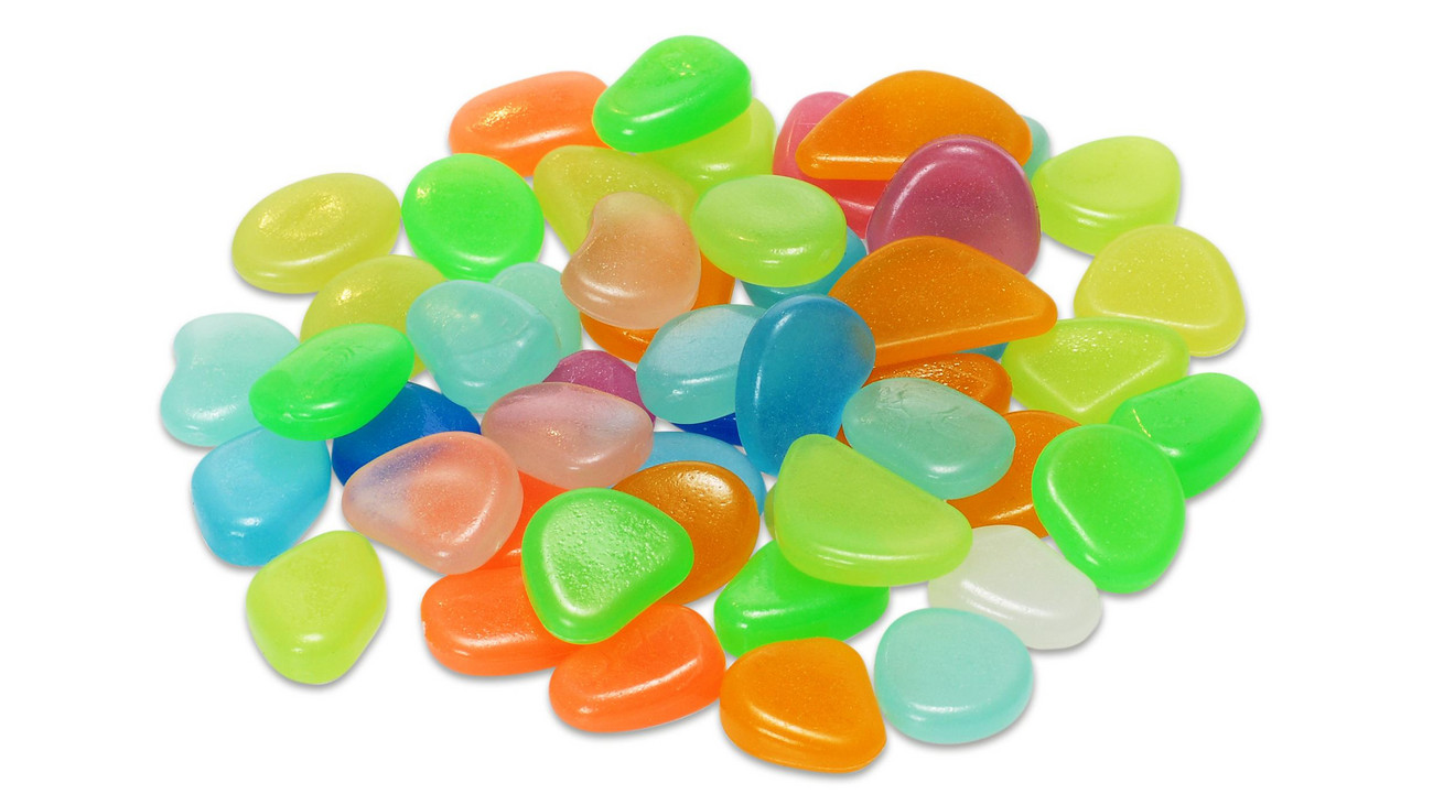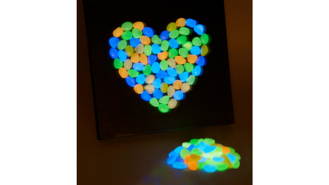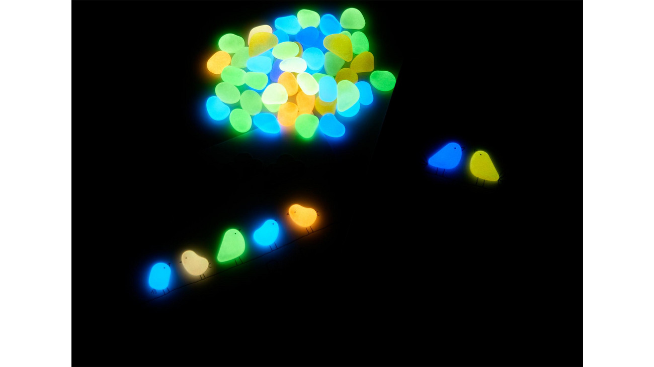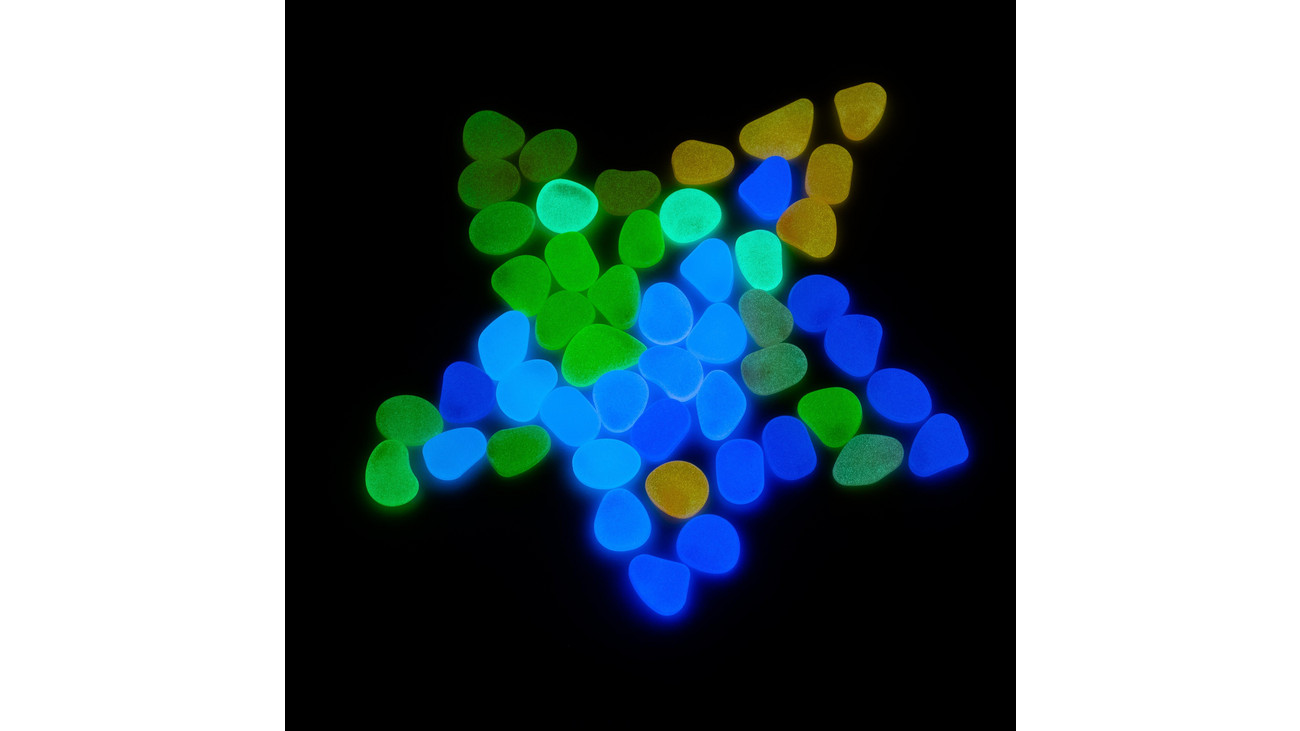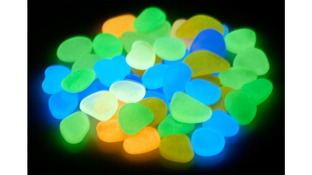 Carregadas à luz solar ou com lâmpada, as pedrinhas brilham no escuro por um curto período.