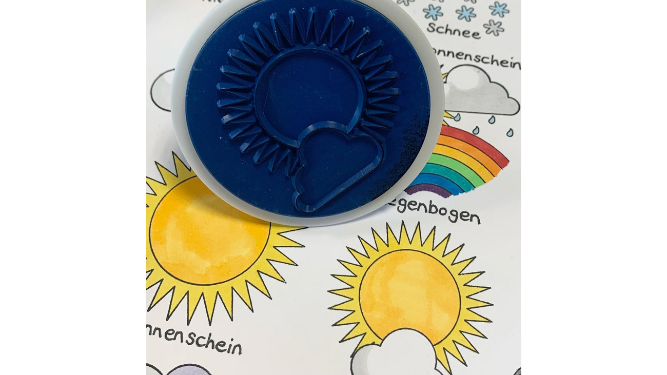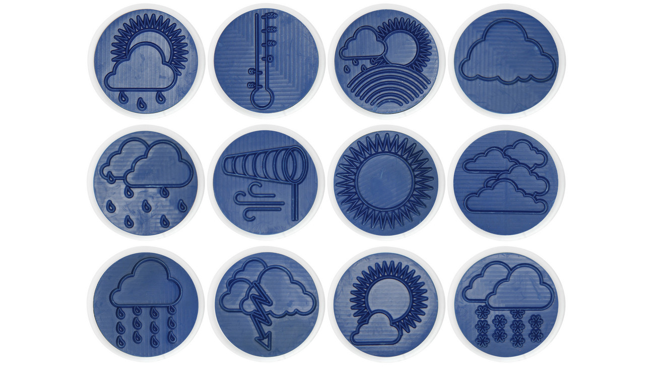 Com os 12 carimbos gigantes, seus alunos podem documentar e desenhar diferentes condições climáticas. As imagens do tempo carimbadas ficam ainda melhores quando pintadas com cores vibrantes. Crianças interessadas podem obter rapidamente uma visão geral do clima dos últimos dias ou semanas.