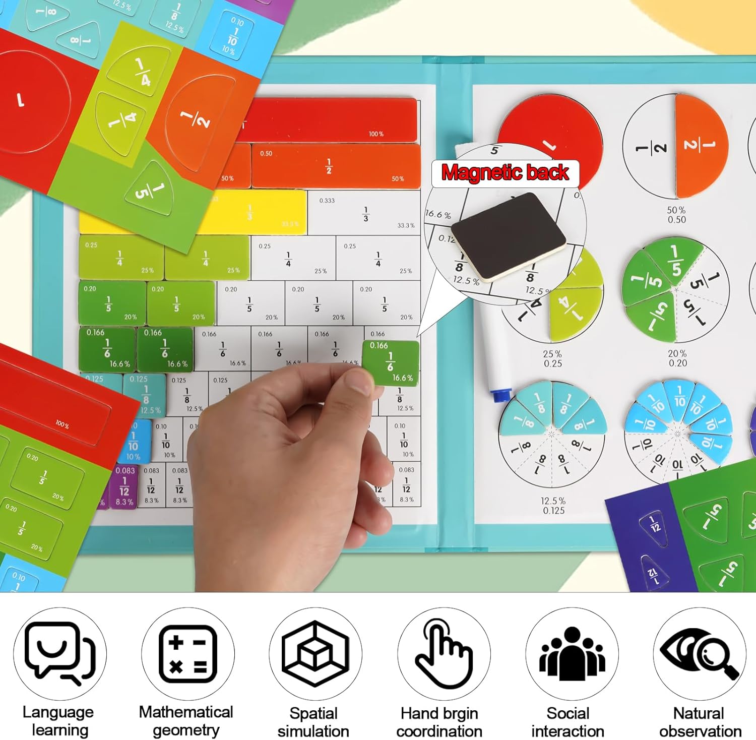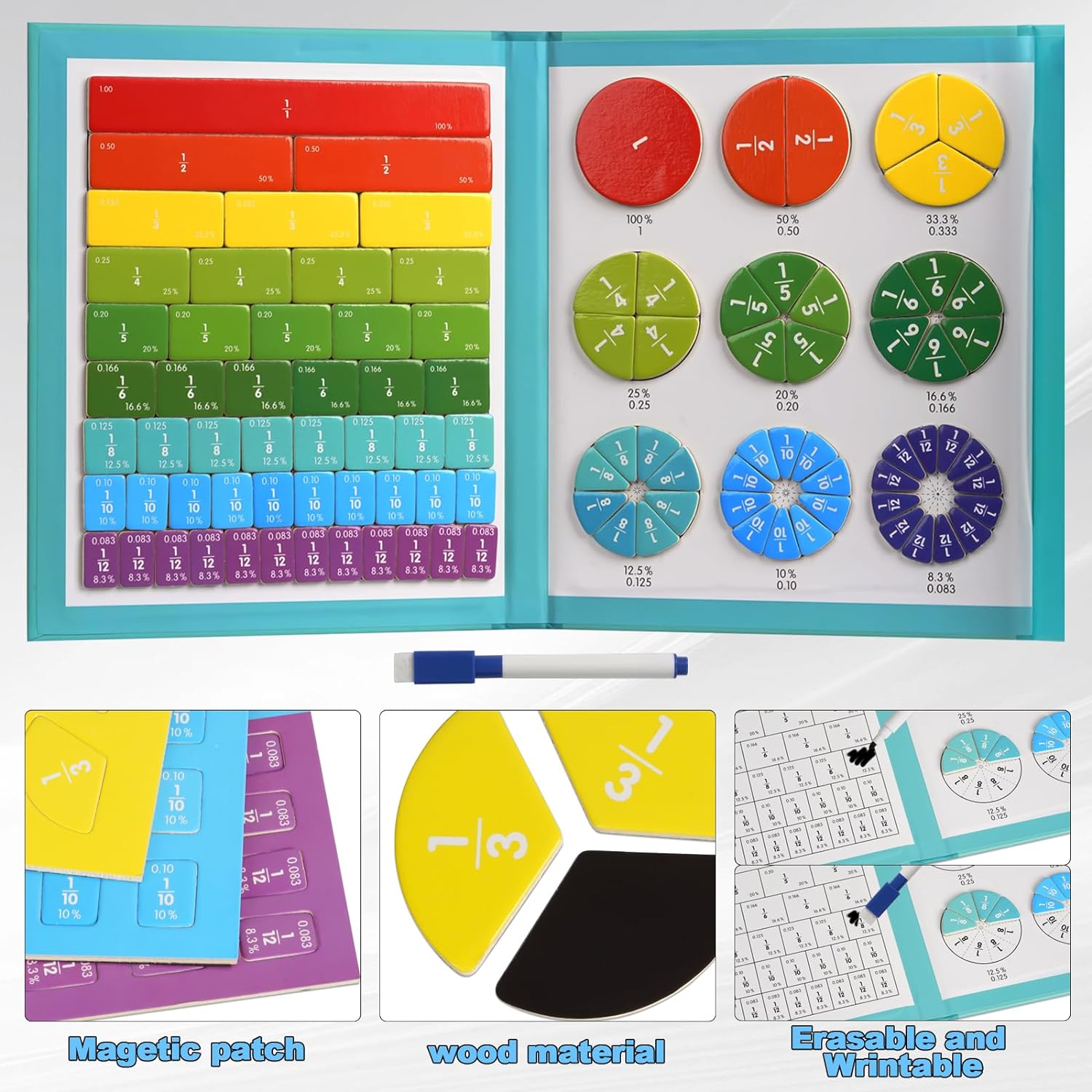 Excelente design: os mosaicos e círculos magnéticos de madeira para frações e percentagens têm um design exclusivo para representar valores de frações e percentagens. Ajuda os alunos a aprender visualmente a aritmética com frações. As cores brilhantes e os números de alto contraste tornam o aprendizado de frações e porcentagens fácil, prático, intuitivo e divertido, ajuda-os a dominar a matemática de maneira fácil e rápida.