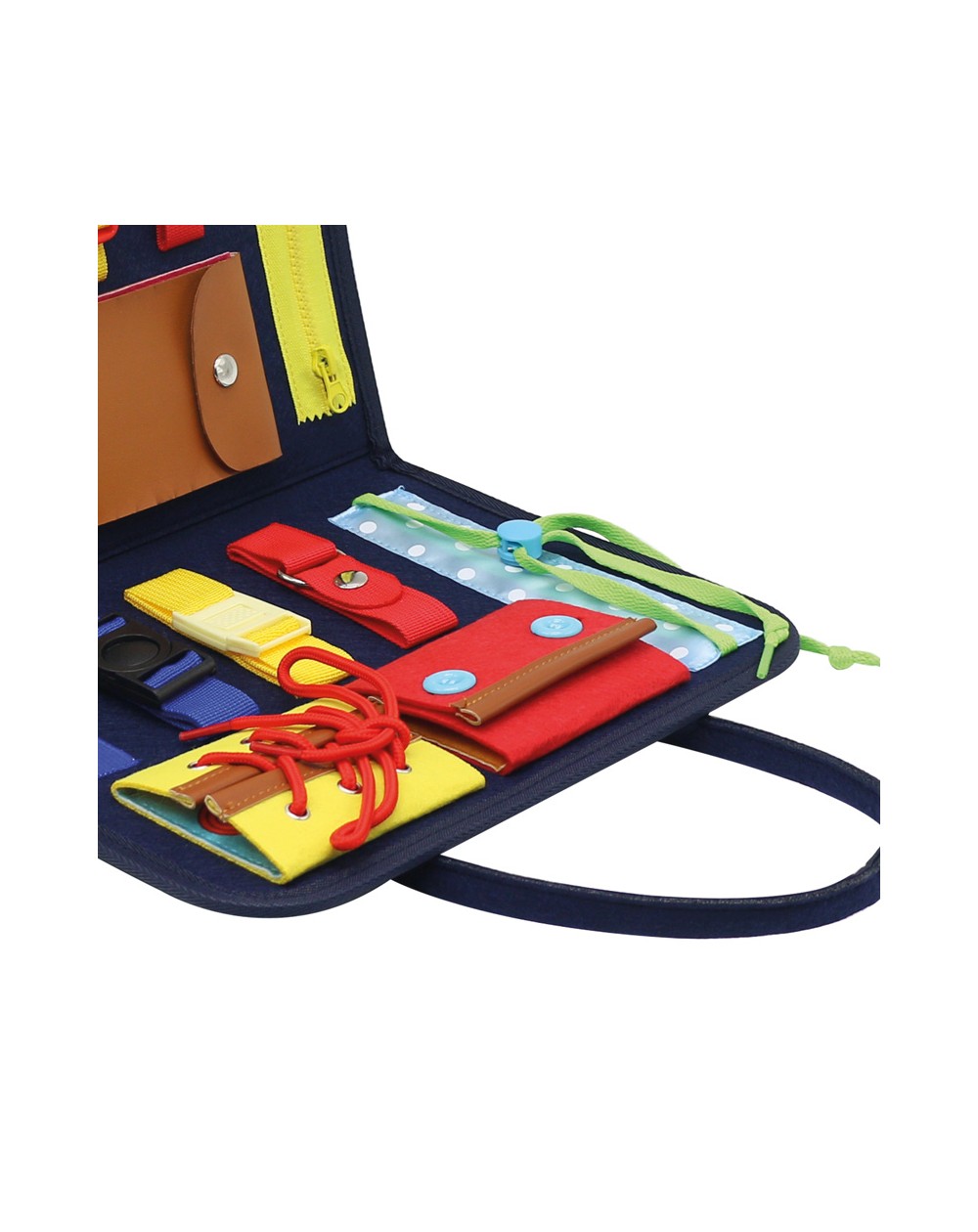 Livro de tecido gigante com 14 tipos diferentes de fechos. Botões, cadarços, fivela, zíper, velcro etc...