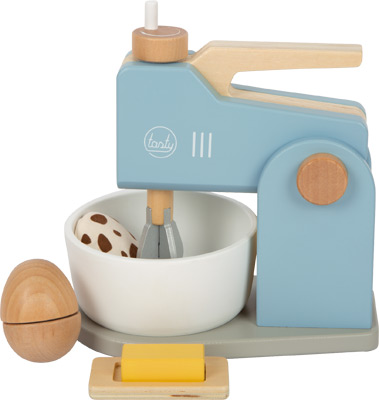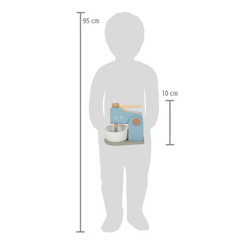 Com este conjunto de batedeira de madeira em azul esfumaçado, branco e muita madeira natural, os pequenos confeiteiros vão se tornar grandes na cozinha infantil! A varinha pode ser enganchada à base da batedeira e ficar de pé para se tornar num utensílio de cozinha elegante num instante. O batedor, que pode ser girado no cabo, garante diversão realista durante o jogo. Com a caixa de mistura de cozimento que inclui biscoitos de pano, biscoitos amanteigados e ovo, crie biscoitos perfeitos graças à tigela, rolo e assadeira.