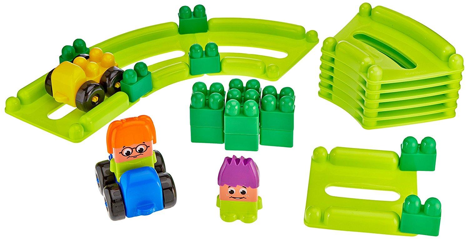 Contém dois veículos, duas personagens, três peças retas, 2 peças curvas, duas rampas, duas peças finais de pista e um folheto com exemplos de construções.