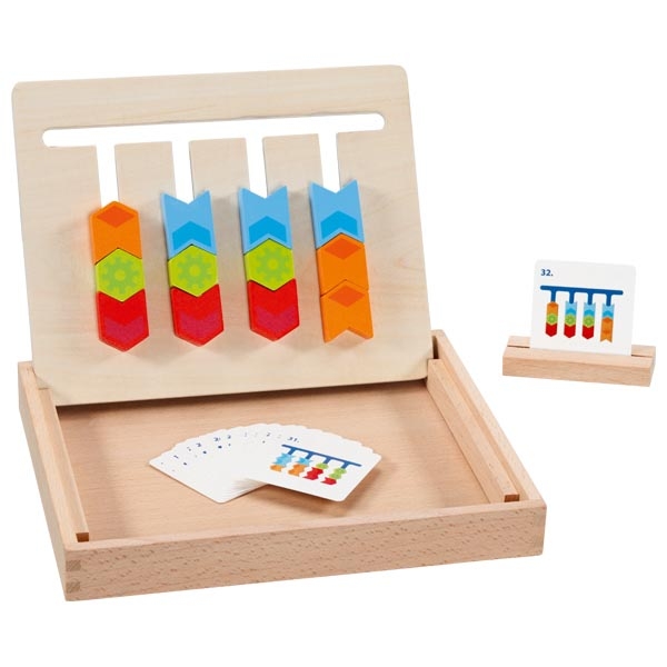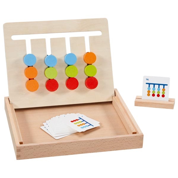 Brinquedo clássico de madeira para classificar as cores de acordo com cartões de modelo. Promove habilidades motoras finas e aprendendo cores e sequências. Com diferentes níveis de dificuldade para iniciantes e especialistas.