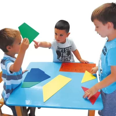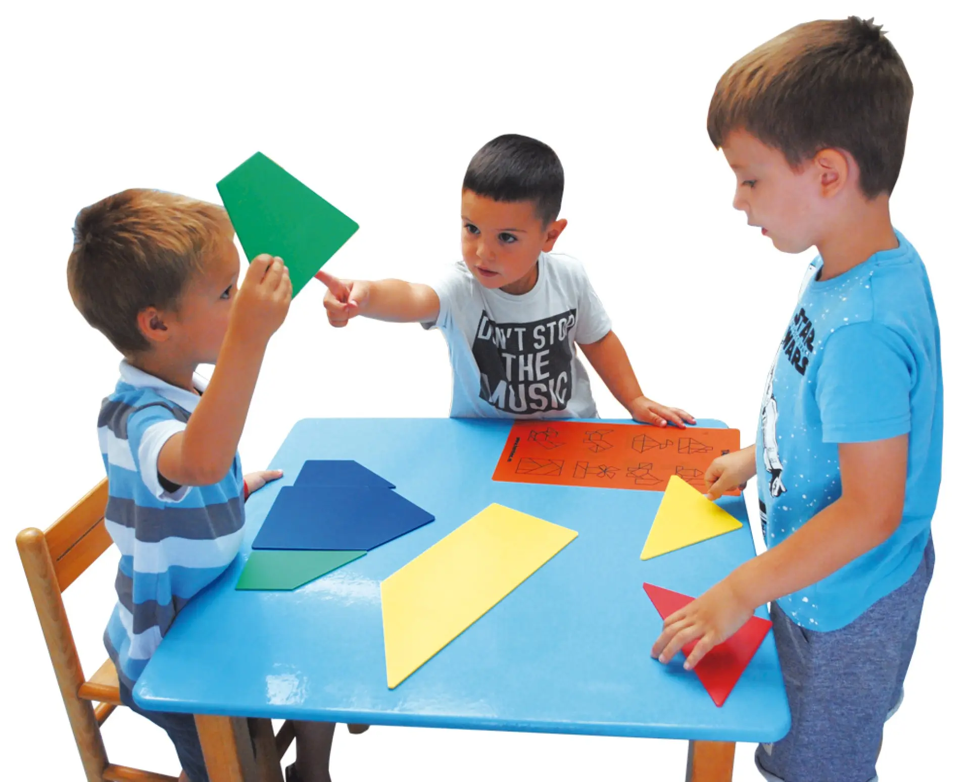 7 peças rígidas de polipropileno de grande formato em cores diferentes. As possibilidades de criação de formas são infinitas. Inclui instruções e exemplos de modelos para fazer.