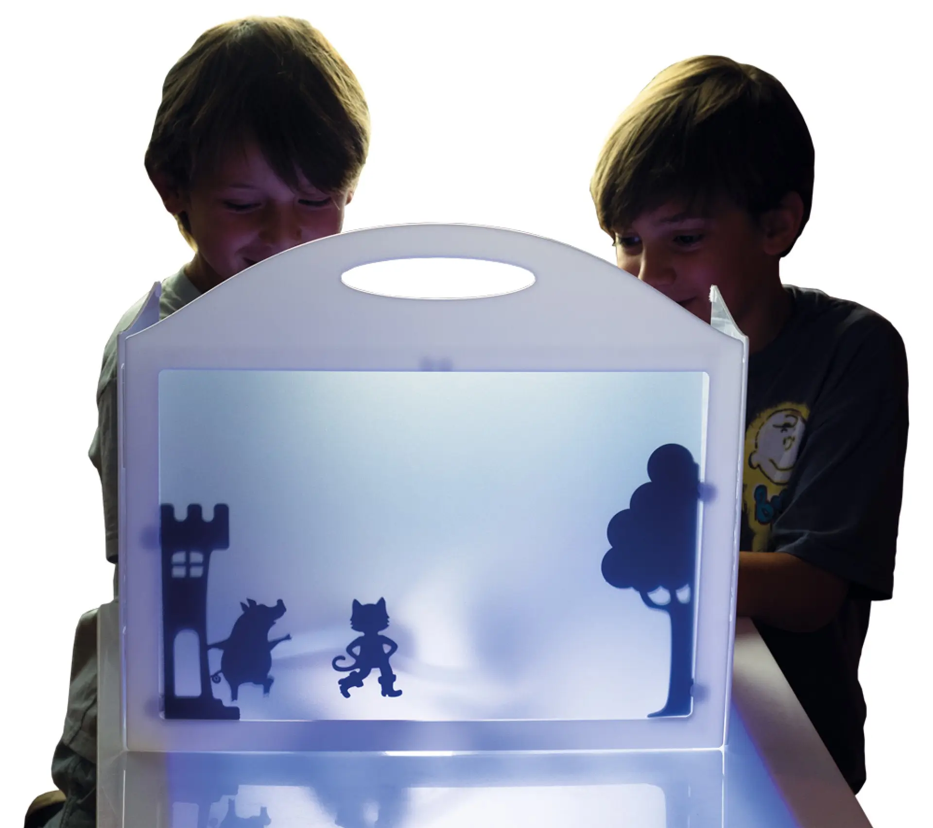Um teatro dobrável e portátil em acrílico branco com tela translúcida para uso com sombras chinesas e mesa de luz.