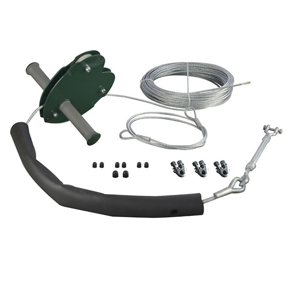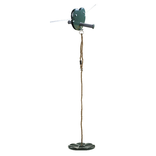 Características: - Peça moldada por injeção em material plástico PA. - Pega suave (antideslizante). - Cabo de aço (comprimento 30m. diâmetro 4mm). - Tensor galvanizado. - Uso particular. - Inclui assento de plástico verde e corda sintética. - Inclui travão para evitar colisões. - Peso máximo por utilizador: 70kg.